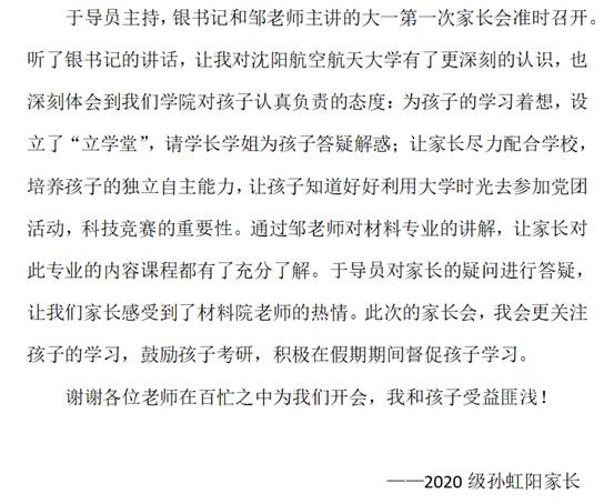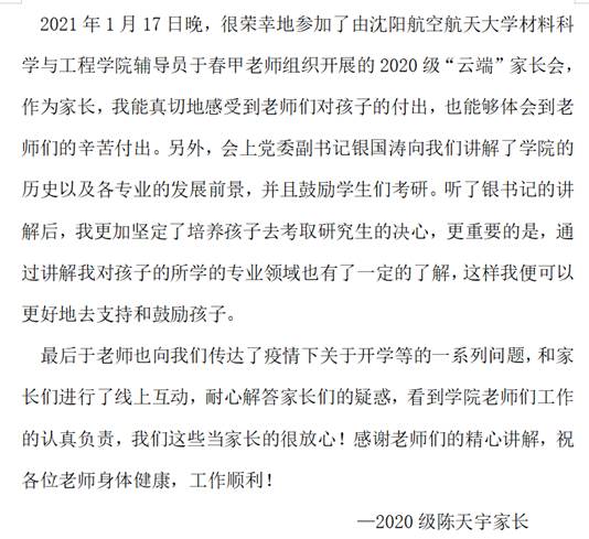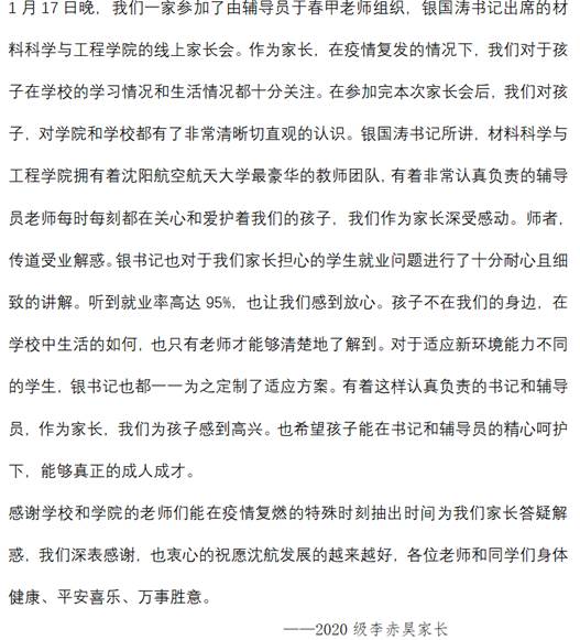 线上家长会,家校共谈心。为进一步落实立德树人根本任务,进一步加强和改进大学生思想政治教育,积极落实《沈阳航空航天大学2021年寒假“云端家访”活动实施方案》,深入了解学院学生及家长的诉求与期许,深化学院与大学生家长的合作沟通,提高大学生思想政治教育水平,yl23411永利集团各年级于一月中下旬陆续举行“线上家长会”。yl23411永利集团院长卢少微、yl23411永利集团党委书记路楠、yl23411永利集团副院长冯长杰、yl23411永利集团党委副书记银国涛、教师代表农智升、邹乃夫、柏冬梅及各年级辅导员老师积极参会。
