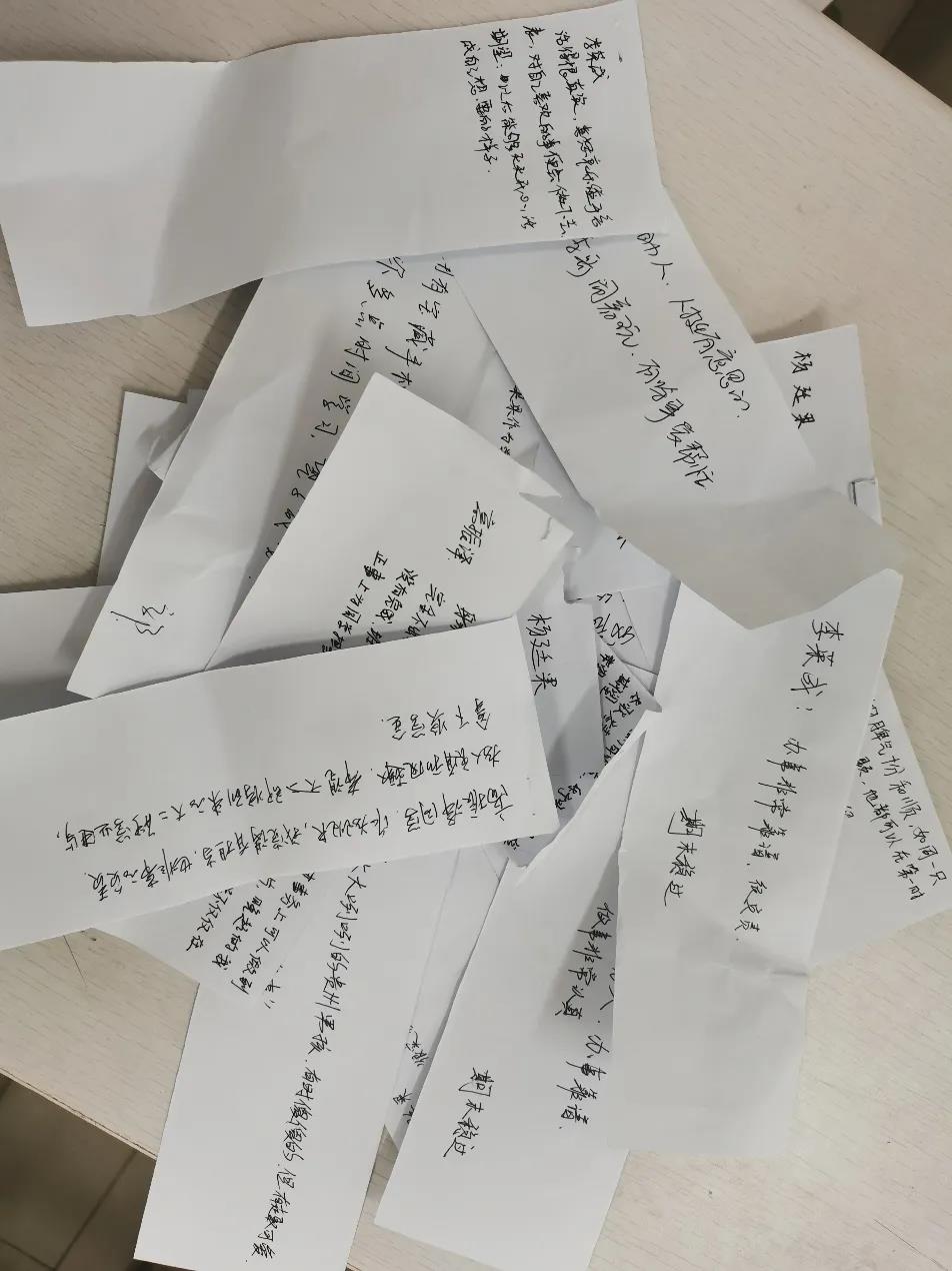 这次特殊的活动增进了同学之间的友谊,来到大学以后这里更像是一个小社会,每一个同学之间都有着不同的交集。一张张纸条记录着发生过的故事,一句句感慨表达了人与人之间最美好的快乐。愿每一位同学都能在这样的一个和谐的大家庭中,活出自己的快乐。