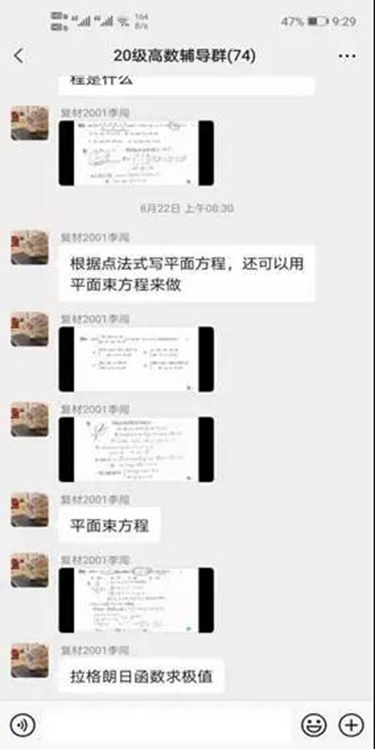 组建线上答疑群,讲师李闯和胥鑫负责答疑群中的帮扶工作中,二人利用微信群分享学霸笔记,在群里为大家解决自己的困难问题。