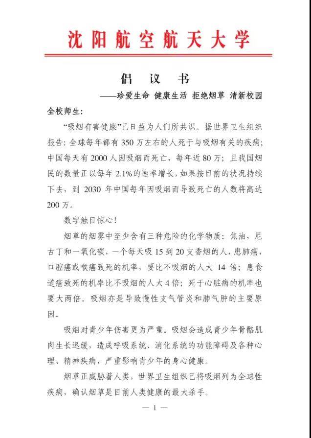 校园是学习知识的圣殿、传承文明的摇篮。共同营造一个绿色、洁净、文明的无烟校园环境,不仅有益于师生的身心健康,而且对全民族体质的增强和良好社会风尚的建立都具有深远的意义。为了提高校园文明水平,保障师生身体健康,树立和展现我院学生良好的精神面貌,我们应该坚决摒弃吸烟行为,创造文明、洁净、优美的校园环境。我们在此向全体大学生发出倡议:创建无烟校园,我们共同行动!