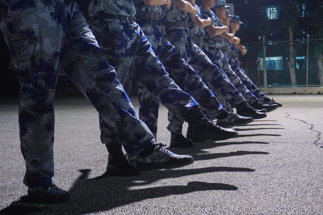 身着整齐迷彩,神情庄重,面对拉直的细绳,臂膀绷直,身姿挺拔如松,教官在一侧目光锐利地审视每个细节。