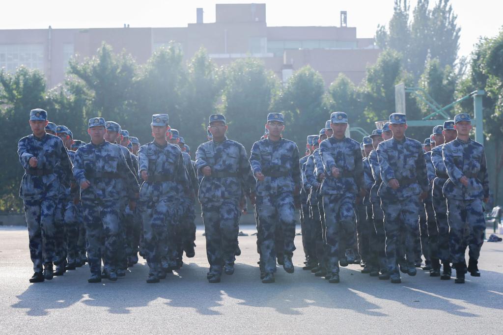 步伐一致,摆臂幅度标准,抬腿高度相同,动作整齐划一,透露着不服输的劲;手扶膝盖,身姿挺拔,长时间蹲姿,双腿早已酸痛,仍毫无动摇,意志坚定的保持着标准姿势。