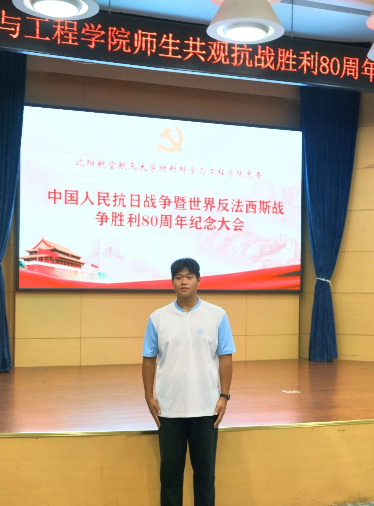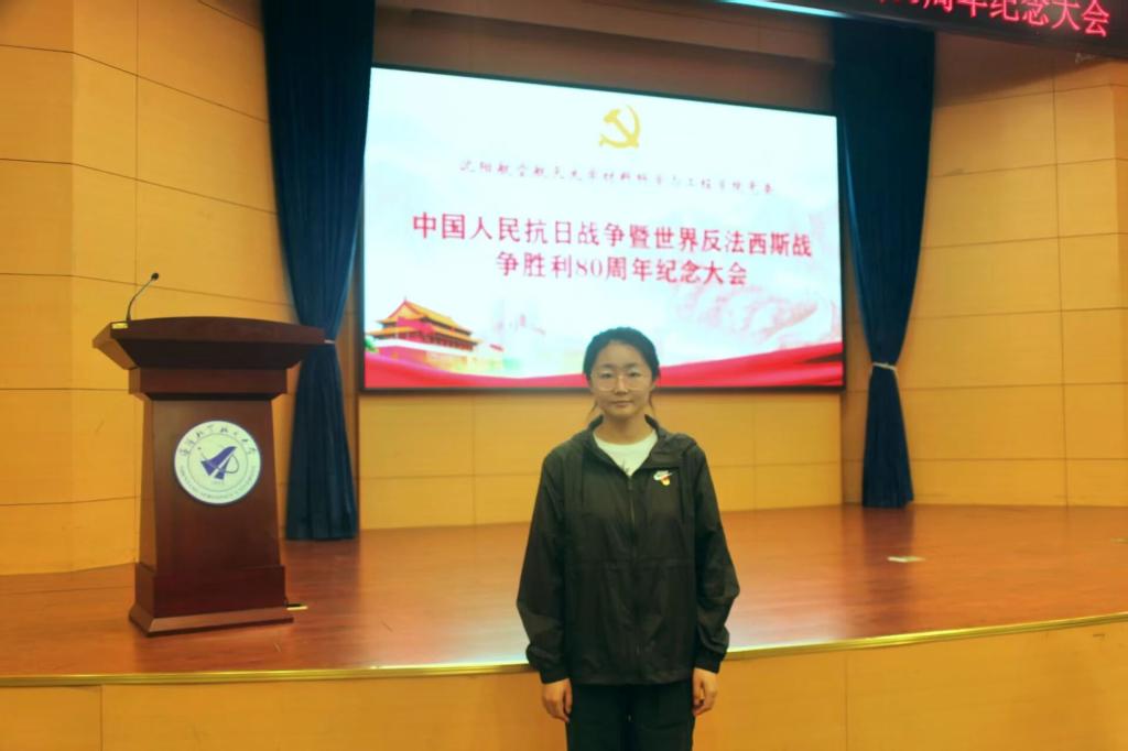 “观看阅兵时,我数次热泪盈眶。尤其是看到抗战老兵,我深刻体会到今天的和平生活来之不易;看到先进的国产装备,我为祖国的强大感到无比自豪。作为沈航材料专业的学生,未来我想投身航空航天材料研发领域,现在要认真学好专业知识,打好理论基础,努力成为一名能为国家航空航天事业贡献力量的工程师。我会把抗战精神记在心里、化为行动,以青春之我、奋斗之我,为实现中华民族伟大复兴的中国梦而努力拼搏!”