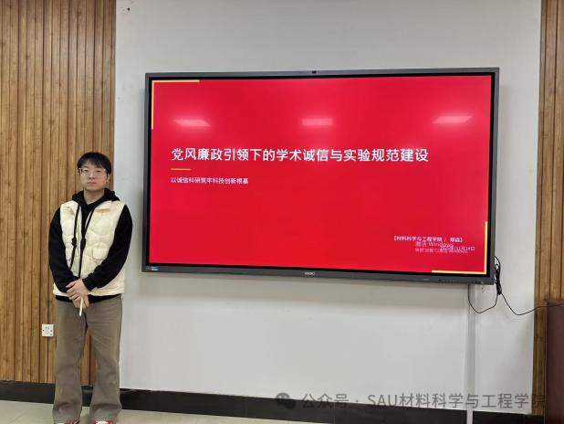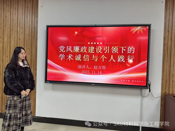 赵方煜分享的主题是“党风廉政建设引领下的学术诚信与个人践行”,她表示我们正处在产业升级与科技自立的关键赛道上,当下的每一次成分调试、每一组性能测试,都是“将个人科研坐标锚定国家发展蓝图”的生动实践。我们既要当好突破关键材料“卡脖子”难题的技术攻坚者,更要做把论文写在祖国大地上、用成果支撑产业强国的时代答卷人。